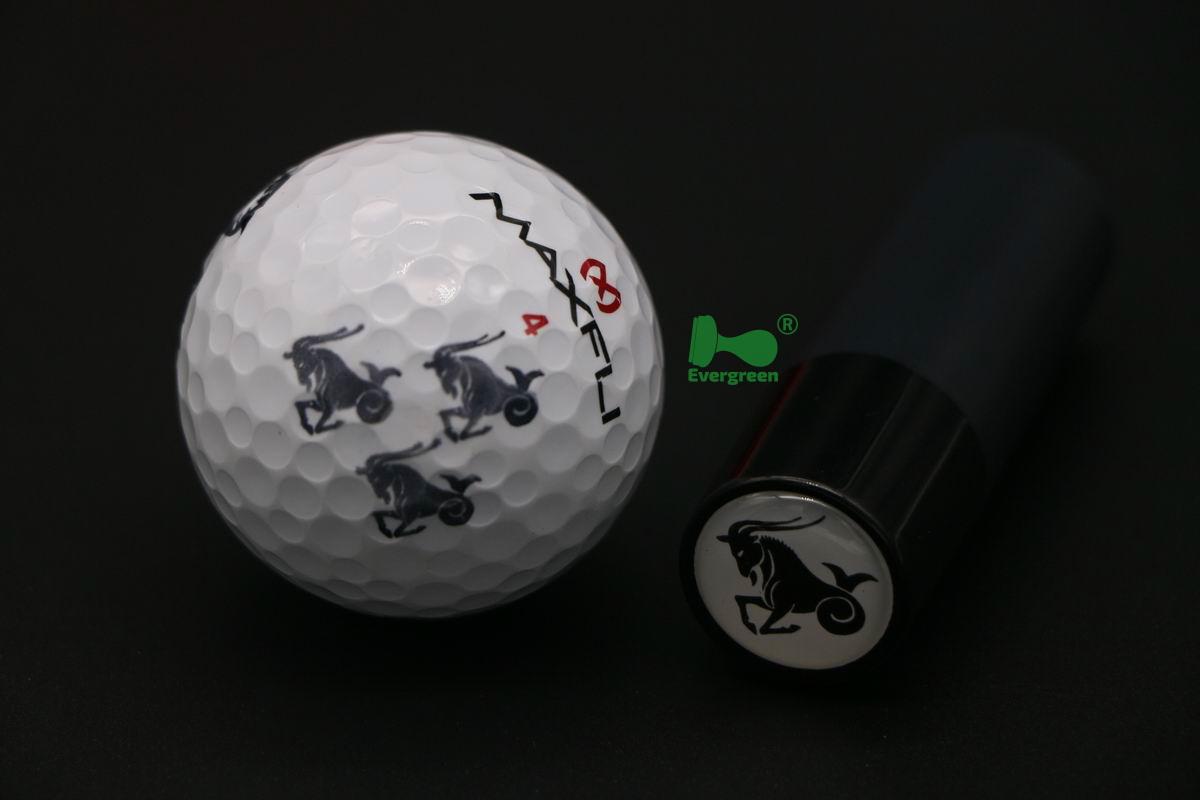 Evergreen pre inked golf ball stamps, can create high quality impressions on the Golf balls, The size of the imprints is around Dia. 11mm . The Golf Ball Stamp uses permanent ink that makes a smudge free imprint that lasts forever on most ball surfaces. and no need a separate ink pad. Now it is easy to mark thousands of personalized golf balls with the Golf Ball Stamp. The flexible stamping surface will conform to any dimpled ball surface and create perfect imprints . You will never hit the wrong ball again by using our golf ball stamps .